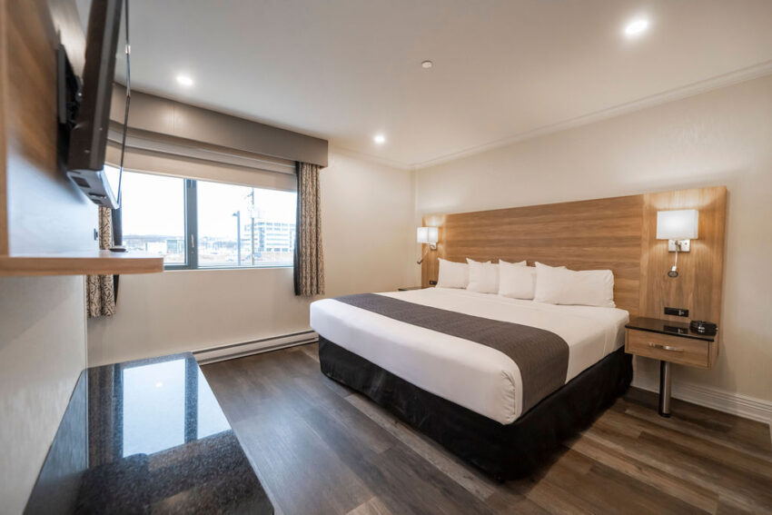 La suite corporative de l’Hôtel et Suites Le Dauphin Québec propose un espace premium de 388 pieds carrés (36 m²) pensé pour le voyageur d’affaires moderne : un grand lit très confortable, un bureau ergonomique et une connexion Internet haute vitesse gratuite pour assurer une productivité optimale. Cette suite corporative offre le parfait équilibre entre détente et efficacité, idéale pour les séjours d’entreprise, les missions de courte durée et les professionnels en télétravail.